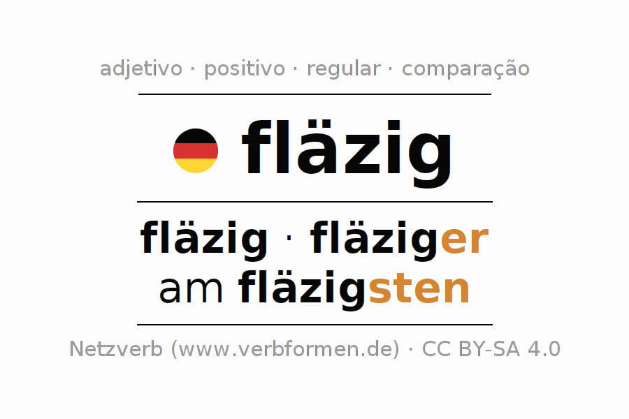 A declinação do adjetivo fläzig (esparramado, largado) utiliza as seguintes formas de comparação fläzig,fläziger,am fläzigsten. As terminações para o comparativo e o superlativo são er/sten. O adjectivo fläzig pode ser utilizado tanto como atributivo antes de um substantivo ou como predicativo junto com um verbo.Não se pode flexionar e comparar somente o adjetivo fläzig, mas sim todos os adjetivos em alemão. Comentários ☆