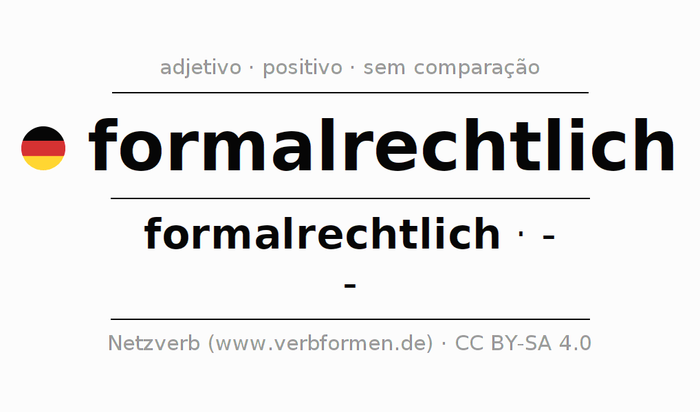 A declinação do adjetivo formalrechtlich não forma o grau de comparação formalrechtlich. O adjectivo não tem forma no comparativo e nem no superlativo. O adjectivo formalrechtlich pode ser utilizado tanto como atributivo antes de um substantivo ou como predicativo junto com um verbo.Não se pode flexionar e comparar somente o adjetivo formalrechtlich, mas sim todos os adjetivos em alemão. Comentários ☆