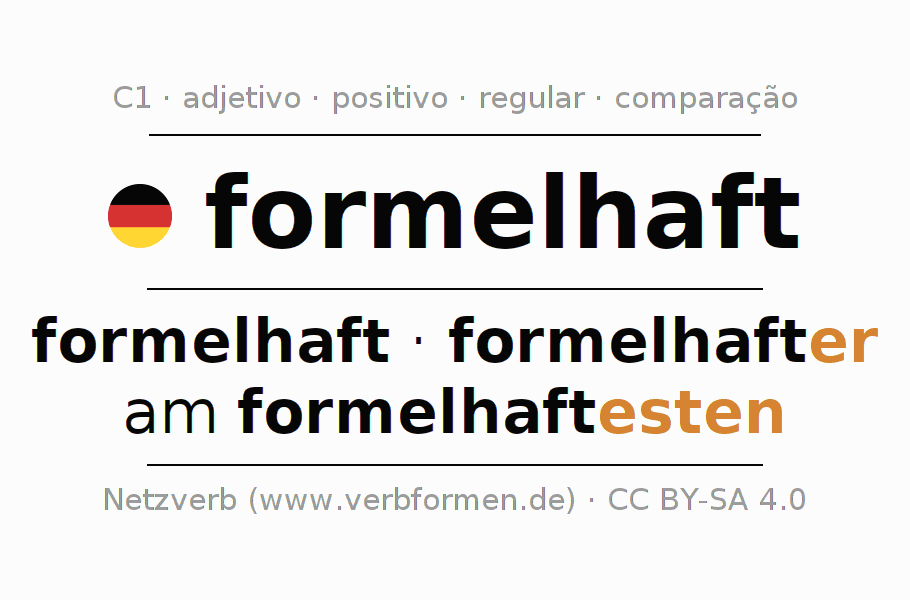 A declinação do adjetivo formelhaft (formal, formulário) utiliza as seguintes formas de comparação formelhaft,formelhafter,am formelhaftesten. As terminações para o comparativo e o superlativo são er/esten. O adjectivo formelhaft pode ser utilizado tanto como atributivo antes de um substantivo ou como predicativo junto com um verbo.Não se pode flexionar e comparar somente o adjetivo formelhaft, mas sim todos os adjetivos em alemão. Comentários ☆
