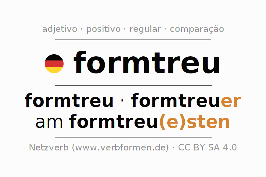 A declinação do adjetivo formtreu (fiel à forma) utiliza as seguintes formas de comparação formtreu,formtreuer,am formtreuesten. As terminações para o comparativo e o superlativo são er/esten. O adjectivo formtreu pode ser utilizado tanto como atributivo antes de um substantivo ou como predicativo junto com um verbo.Não se pode flexionar e comparar somente o adjetivo formtreu, mas sim todos os adjetivos em alemão. Comentários ☆