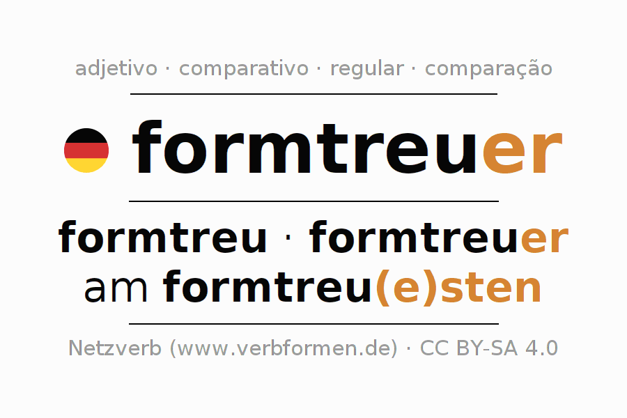 A declinação do adjetivo formtreuer (fiel à forma) utiliza as seguintes formas de comparação formtreu,formtreuer,am formtreuesten. As terminações para o comparativo e o superlativo são er/esten. O adjectivo formtreuer pode ser utilizado tanto como atributivo antes de um substantivo ou como predicativo junto com um verbo.Não se pode flexionar e comparar somente o adjetivo formtreuer, mas sim todos os adjetivos em alemão. Comentários ☆