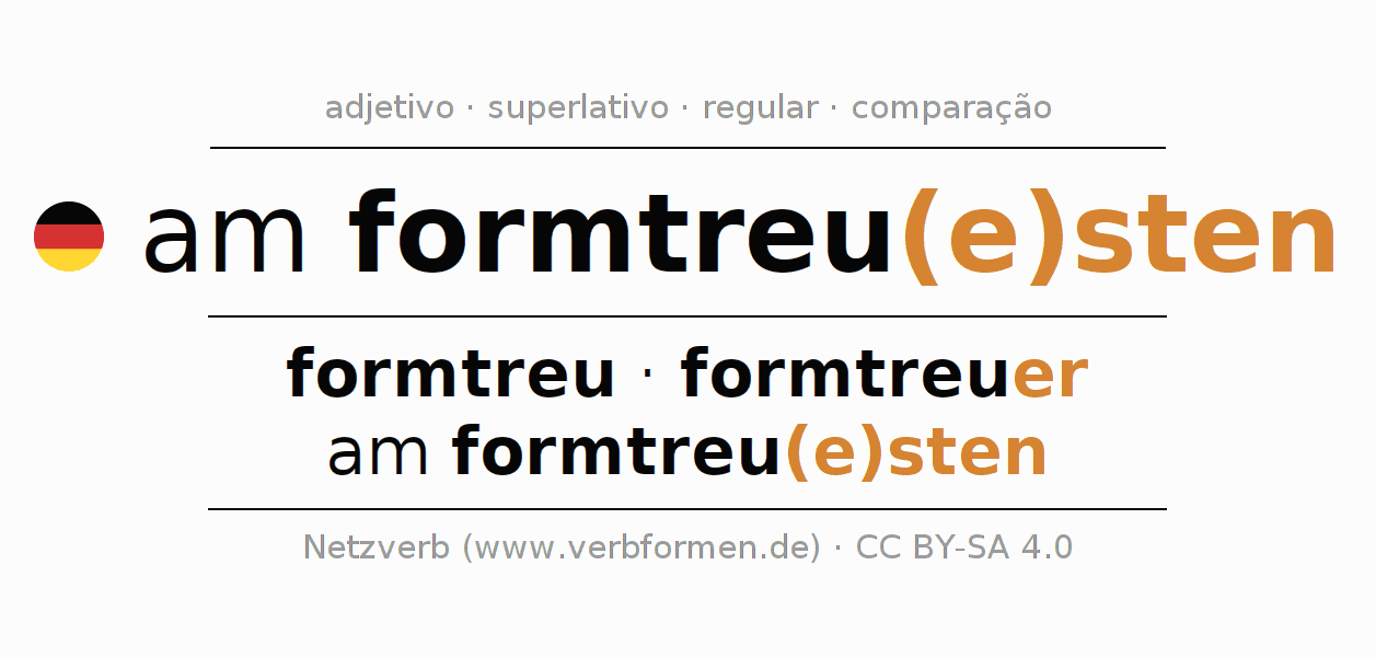 A declinação do adjetivo am formtreuesten (fiel à forma) utiliza as seguintes formas de comparação formtreu,formtreuer,am formtreuesten. As terminações para o comparativo e o superlativo são er/esten. O adjectivo am formtreuesten pode ser utilizado tanto como atributivo antes de um substantivo ou como predicativo junto com um verbo.Não se pode flexionar e comparar somente o adjetivo am formtreuesten, mas sim todos os adjetivos em alemão. Comentários ☆