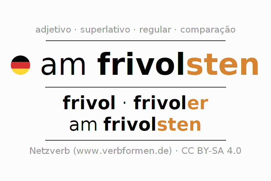 A declinação do adjetivo am frivolsten (frívolo, leviano) utiliza as seguintes formas de comparação frivol,frivoler,am frivolsten. As terminações para o comparativo e o superlativo são er/sten. O adjectivo am frivolsten pode ser utilizado tanto como atributivo antes de um substantivo ou como predicativo junto com um verbo.Não se pode flexionar e comparar somente o adjetivo am frivolsten, mas sim todos os adjetivos em alemão. Comentários ☆
