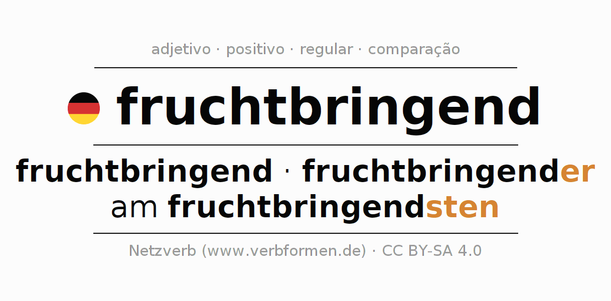 A declinação do adjetivo fruchtbringend (frutífero, produtivo) utiliza as seguintes formas de comparação fruchtbringend,fruchtbringender,am fruchtbringendsten. As terminações para o comparativo e o superlativo são er/sten. O adjectivo fruchtbringend pode ser utilizado tanto como atributivo antes de um substantivo ou como predicativo junto com um verbo.Não se pode flexionar e comparar somente o adjetivo fruchtbringend, mas sim todos os adjetivos em alemão. Comentários ☆