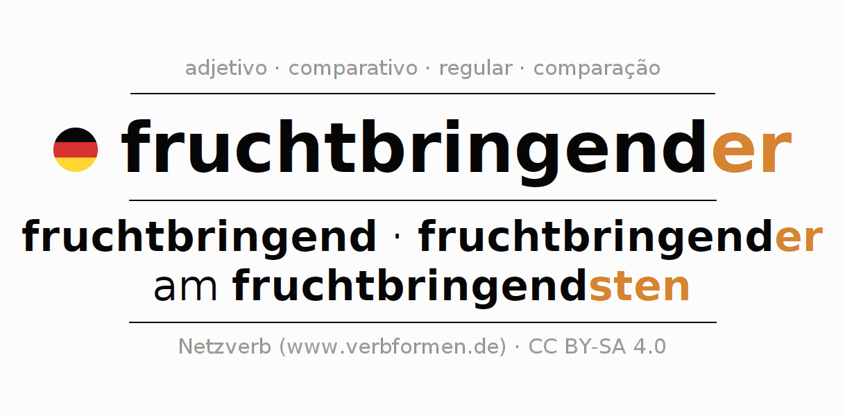 A declinação do adjetivo fruchtbringender (frutífero, produtivo) utiliza as seguintes formas de comparação fruchtbringend,fruchtbringender,am fruchtbringendsten. As terminações para o comparativo e o superlativo são er/sten. O adjectivo fruchtbringender pode ser utilizado tanto como atributivo antes de um substantivo ou como predicativo junto com um verbo.Não se pode flexionar e comparar somente o adjetivo fruchtbringender, mas sim todos os adjetivos em alemão. Comentários ☆