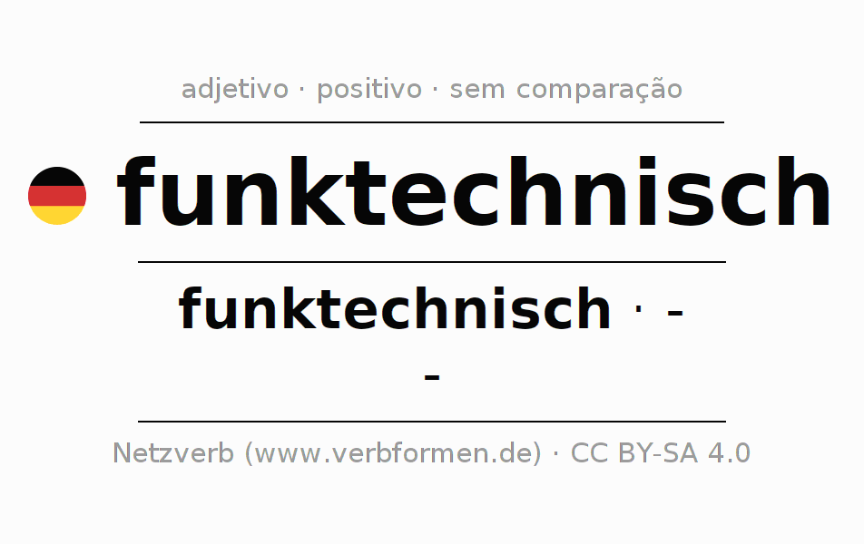 A declinação do adjetivo funktechnisch não forma o grau de comparação funktechnisch. O adjectivo não tem forma no comparativo e nem no superlativo. O adjectivo funktechnisch pode ser utilizado tanto como atributivo antes de um substantivo ou como predicativo junto com um verbo.Não se pode flexionar e comparar somente o adjetivo funktechnisch, mas sim todos os adjetivos em alemão. Comentários ☆
