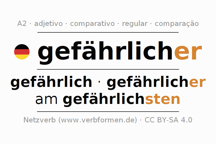 A declinação do adjetivo gefährlicher (perigoso, arriscado) utiliza as seguintes formas de comparação gefährlich,gefährlicher,am gefährlichsten. As terminações para o comparativo e o superlativo são er/sten. O adjectivo gefährlicher pode ser utilizado tanto como atributivo antes de um substantivo ou como predicativo junto com um verbo.Não se pode flexionar e comparar somente o adjetivo gefährlicher, mas sim todos os adjetivos em alemão. Comentários ☆