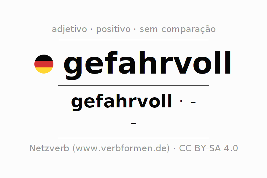 A declinação do adjetivo gefahrvoll não forma o grau de comparação gefahrvoll. O adjectivo não tem forma no comparativo e nem no superlativo. O adjectivo gefahrvoll pode ser utilizado tanto como atributivo antes de um substantivo ou como predicativo junto com um verbo.Não se pode flexionar e comparar somente o adjetivo gefahrvoll, mas sim todos os adjetivos em alemão. Comentários ☆