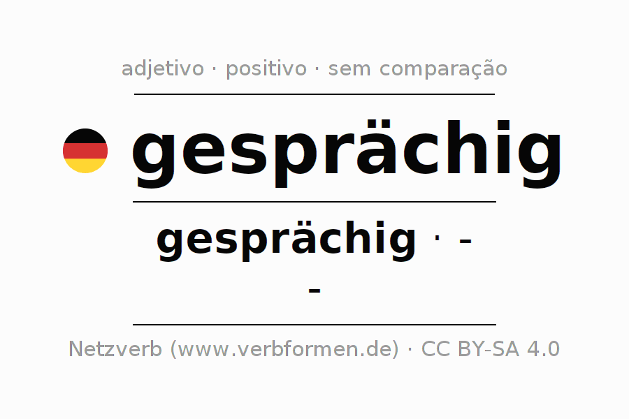 A declinação do adjetivo gesprächig não forma o grau de comparação gesprächig. O adjectivo não tem forma no comparativo e nem no superlativo. O adjectivo gesprächig pode ser utilizado tanto como atributivo antes de um substantivo ou como predicativo junto com um verbo.Não se pode flexionar e comparar somente o adjetivo gesprächig, mas sim todos os adjetivos em alemão. Comentários ☆