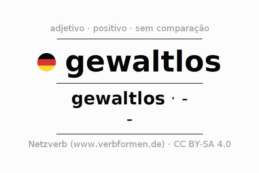 A declinação do adjetivo gewaltlos não forma o grau de comparação gewaltlos. O adjectivo não tem forma no comparativo e nem no superlativo. O adjectivo gewaltlos pode ser utilizado tanto como atributivo antes de um substantivo ou como predicativo junto com um verbo.Não se pode flexionar e comparar somente o adjetivo gewaltlos, mas sim todos os adjetivos em alemão. Comentários ☆