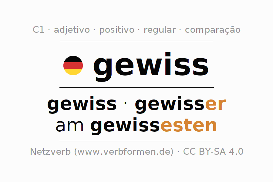 A declinação do adjetivo gewiss (certo, sem dúvida) utiliza as seguintes formas de comparação gewiss,gewisser,am gewissesten. As terminações para o comparativo e o superlativo são er/esten. O adjectivo gewiss pode ser utilizado tanto como atributivo antes de um substantivo ou como predicativo junto com um verbo.Não se pode flexionar e comparar somente o adjetivo gewiss, mas sim todos os adjetivos em alemão. Comentários ☆