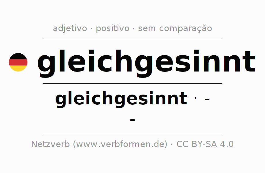 A declinação do adjetivo gleichgesinnt não forma o grau de comparação gleichgesinnt. O adjectivo não tem forma no comparativo e nem no superlativo. O adjectivo gleichgesinnt pode ser utilizado tanto como atributivo antes de um substantivo ou como predicativo junto com um verbo.Não se pode flexionar e comparar somente o adjetivo gleichgesinnt, mas sim todos os adjetivos em alemão. Comentários ☆