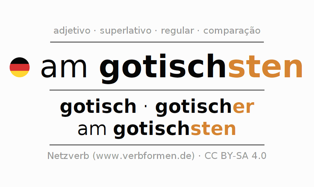 A declinação do adjetivo am gotischsten (gótico, antiquado) utiliza as seguintes formas de comparação gotisch,gotischer,am gotischsten. As terminações para o comparativo e o superlativo são er/sten. O adjectivo am gotischsten pode ser utilizado tanto como atributivo antes de um substantivo ou como predicativo junto com um verbo.Não se pode flexionar e comparar somente o adjetivo am gotischsten, mas sim todos os adjetivos em alemão. Comentários ☆