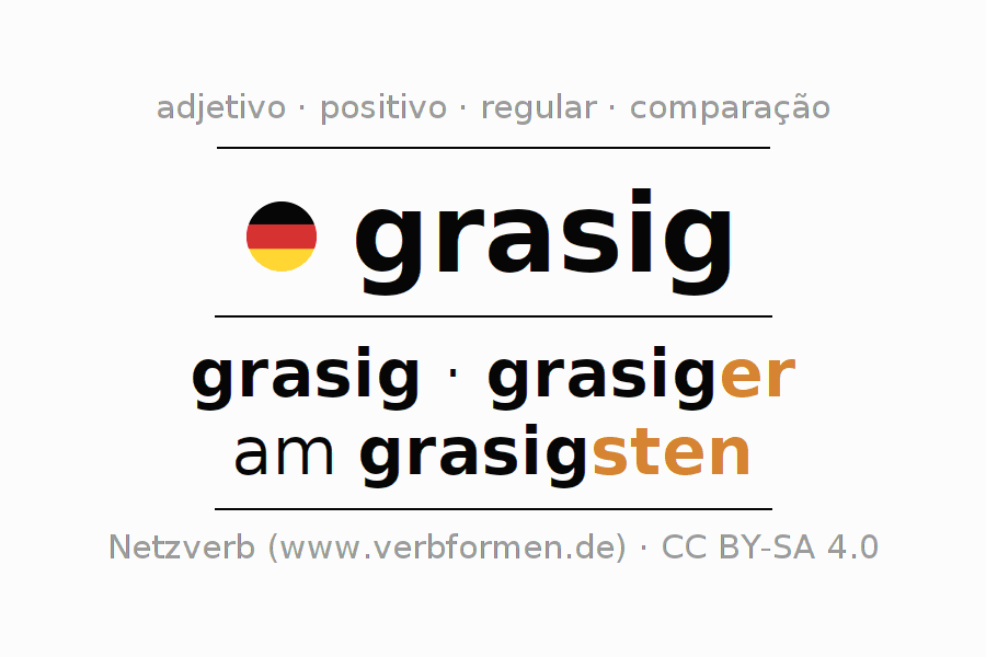A declinação do adjetivo grasig (de grama, herboso) utiliza as seguintes formas de comparação grasig,grasiger,am grasigsten. As terminações para o comparativo e o superlativo são er/sten. O adjectivo grasig pode ser utilizado tanto como atributivo antes de um substantivo ou como predicativo junto com um verbo.Não se pode flexionar e comparar somente o adjetivo grasig, mas sim todos os adjetivos em alemão. Comentários ☆