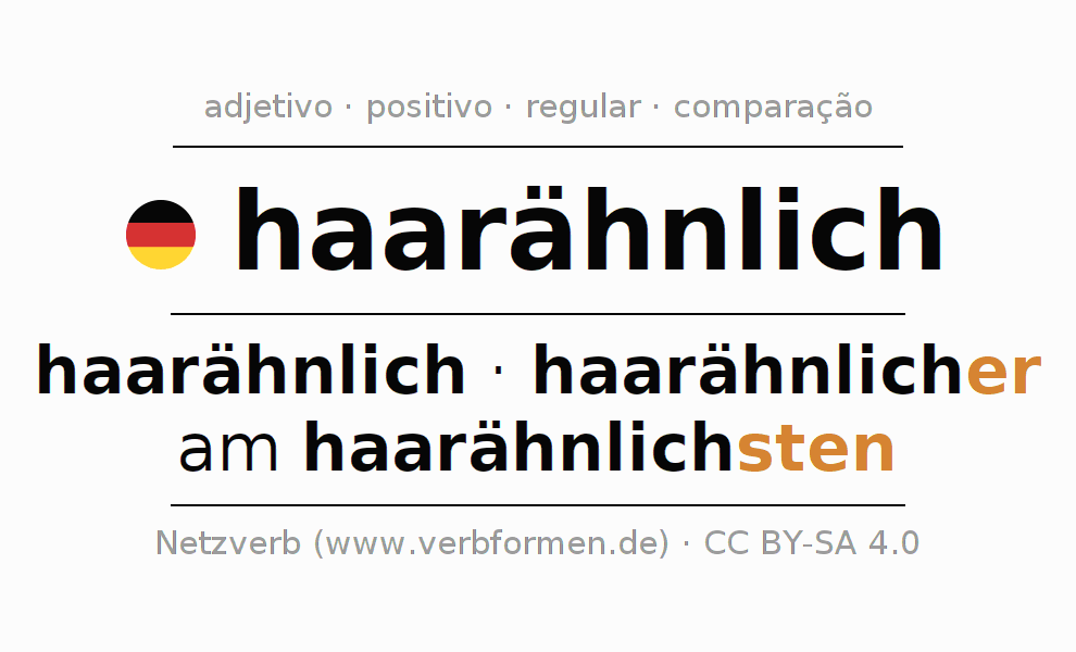 A declinação do adjetivo haarähnlich (cabeludo, semelhante ao cabelo) utiliza as seguintes formas de comparação haarähnlich,haarähnlicher,am haarähnlichsten. As terminações para o comparativo e o superlativo são er/sten. O adjectivo haarähnlich pode ser utilizado tanto como atributivo antes de um substantivo ou como predicativo junto com um verbo.Não se pode flexionar e comparar somente o adjetivo haarähnlich, mas sim todos os adjetivos em alemão. Comentários ☆