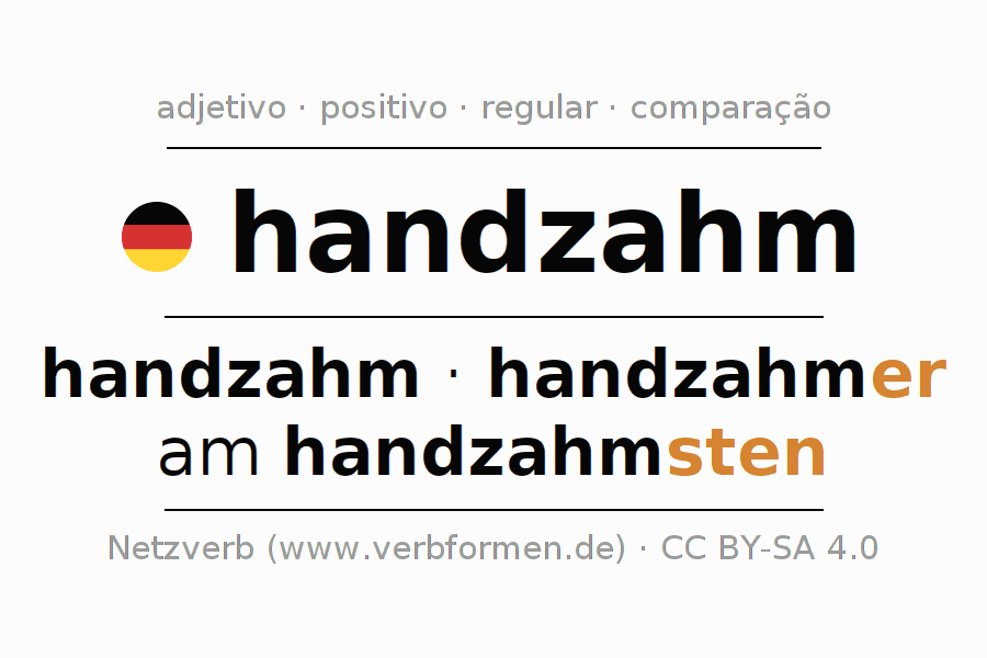 A declinação do adjetivo handzahm (domado, manso) utiliza as seguintes formas de comparação handzahm,handzahmer,am handzahmsten. As terminações para o comparativo e o superlativo são er/sten. O adjectivo handzahm pode ser utilizado tanto como atributivo antes de um substantivo ou como predicativo junto com um verbo.Não se pode flexionar e comparar somente o adjetivo handzahm, mas sim todos os adjetivos em alemão. Comentários ☆
