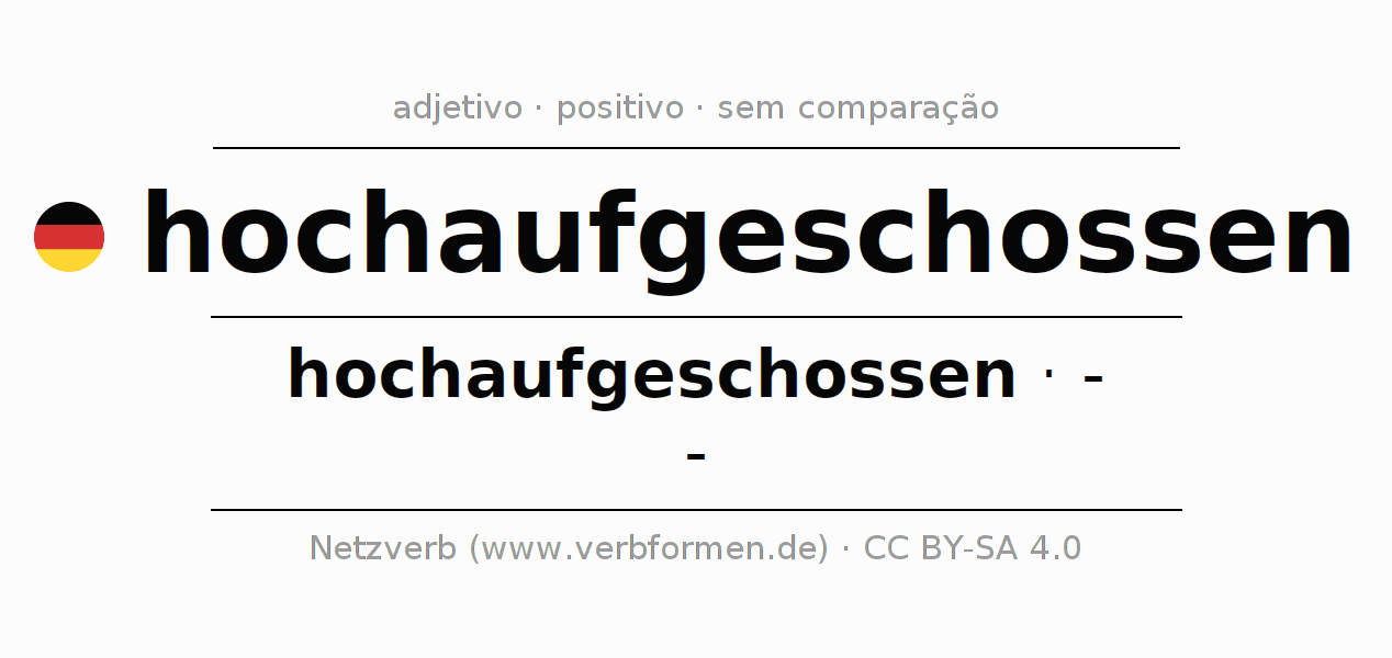 A declinação do adjetivo hochaufgeschossen não forma o grau de comparação hochaufgeschossen. O adjectivo não tem forma no comparativo e nem no superlativo. O adjectivo hochaufgeschossen pode ser utilizado tanto como atributivo antes de um substantivo ou como predicativo junto com um verbo.Não se pode flexionar e comparar somente o adjetivo hochaufgeschossen, mas sim todos os adjetivos em alemão. Comentários ☆