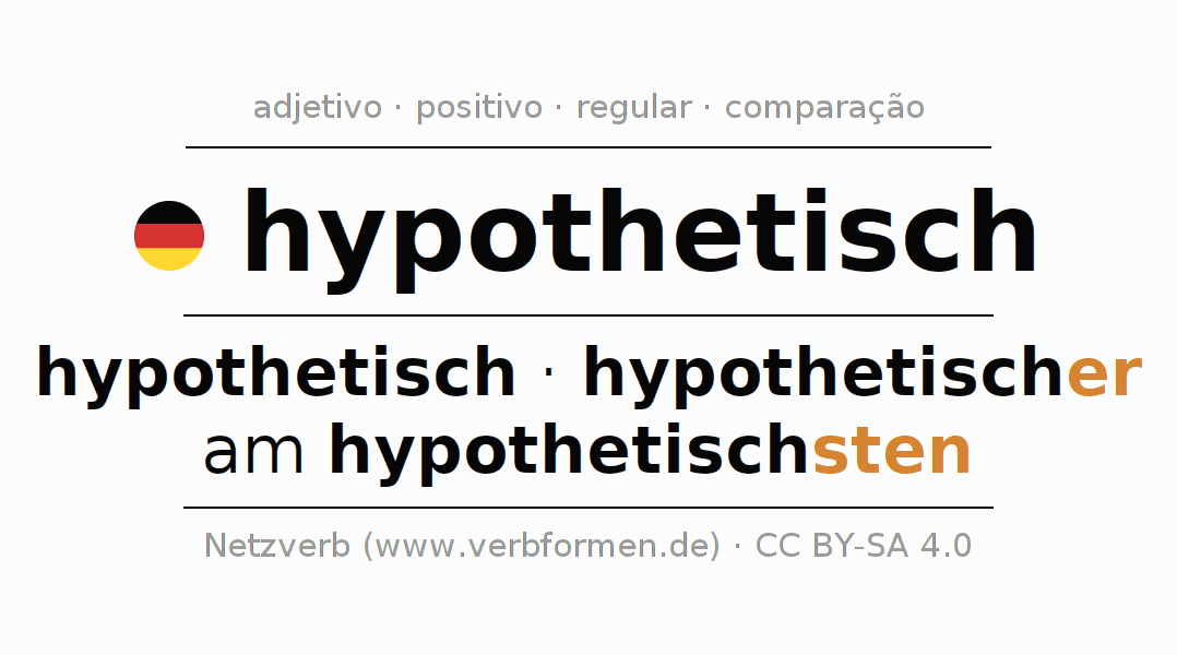 A declinação e o comparativo de hypothetisch são apresentados online em tabelas em todas as formas: forte, fraca e mista. Assim como no singular e no plural. Também são apresentados os 4 casos: nominativo (auch 1. Fall, Wer-Fall), genitivo (auch 2. Fall, Wes-Fall, Wessen-Fall), dativo (auch3. Fall, Wem-Fall) e acusativo (auch4. Fall, Wen-Fall). Mais informações podem ser encontradas em Wiktionary hypothetisch e hypothetisch no Duden.