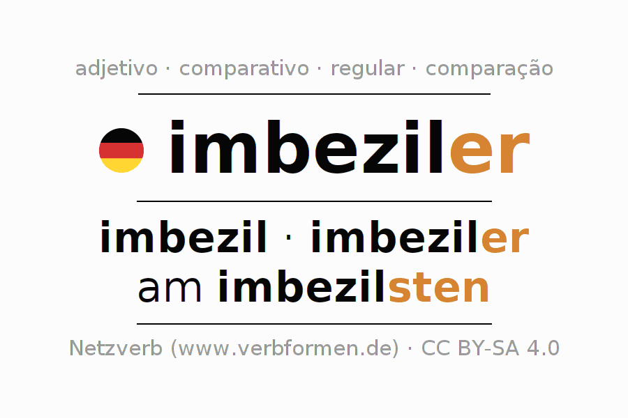 A declinação do adjetivo imbeziler (deficiente) utiliza as seguintes formas de comparação imbezil,imbeziler,am imbezilsten. As terminações para o comparativo e o superlativo são er/sten. O adjectivo imbeziler pode ser utilizado tanto como atributivo antes de um substantivo ou como predicativo junto com um verbo.Não se pode flexionar e comparar somente o adjetivo imbeziler, mas sim todos os adjetivos em alemão. Comentários ☆