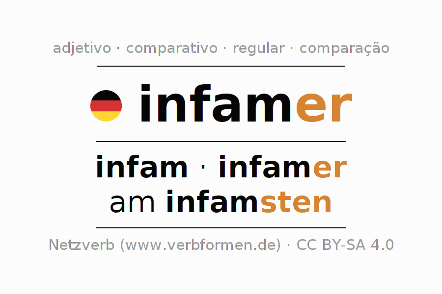 A declinação do adjetivo infamer (infame, desonroso) utiliza as seguintes formas de comparação infam,infamer,am infamsten. As terminações para o comparativo e o superlativo são er/sten. O adjectivo infamer pode ser utilizado tanto como atributivo antes de um substantivo ou como predicativo junto com um verbo.Não se pode flexionar e comparar somente o adjetivo infamer, mas sim todos os adjetivos em alemão. Comentários ☆