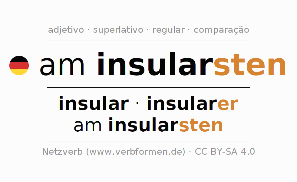 A declinação do adjetivo am insularsten utiliza as seguintes formas de comparação insular,insularer,am insularsten. As terminações para o comparativo e o superlativo são er/sten. O adjectivo am insularsten pode ser utilizado tanto como atributivo antes de um substantivo ou como predicativo junto com um verbo.Não se pode flexionar e comparar somente o adjetivo am insularsten, mas sim todos os adjetivos em alemão. Comentários ☆