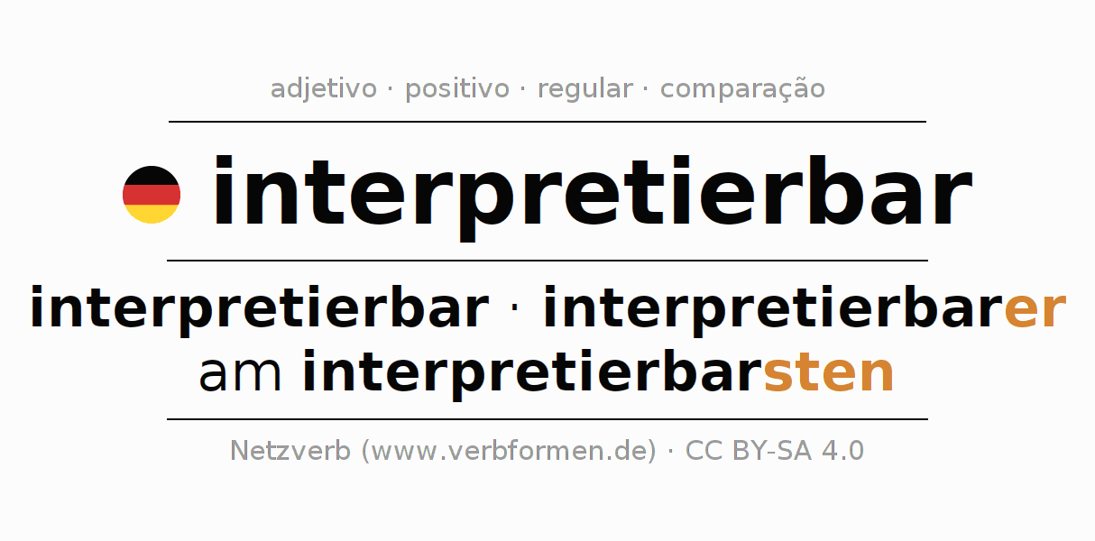 A declinação do adjetivo interpretierbar (interpretável) utiliza as seguintes formas de comparação interpretierbar,interpretierbarer,am interpretierbarsten. As terminações para o comparativo e o superlativo são er/sten. O adjectivo interpretierbar pode ser utilizado tanto como atributivo antes de um substantivo ou como predicativo junto com um verbo.Não se pode flexionar e comparar somente o adjetivo interpretierbar, mas sim todos os adjetivos em alemão. Comentários ☆