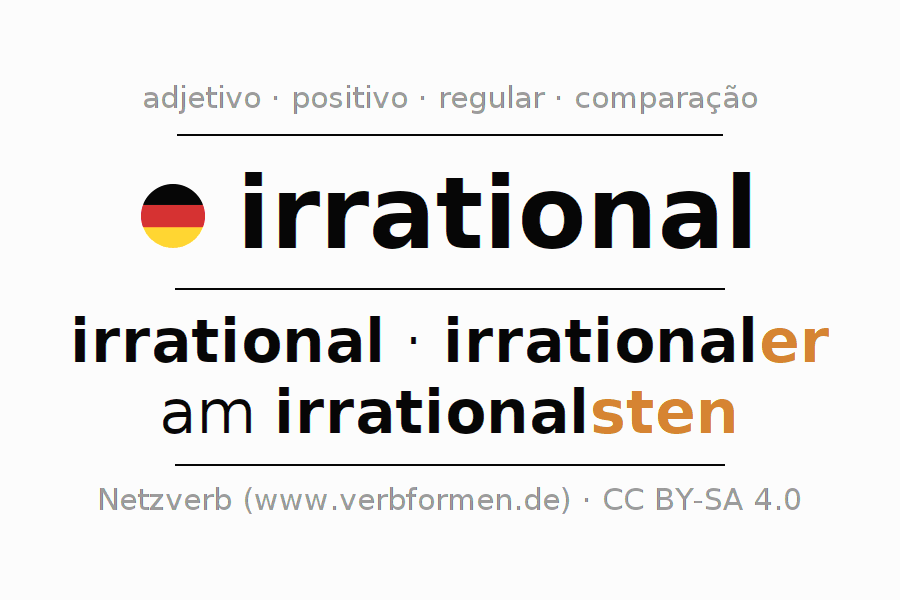 A declinação do adjetivo irrational (irracional) utiliza as seguintes formas de comparação irrational,irrationaler,am irrationalsten. As terminações para o comparativo e o superlativo são er/sten. O adjectivo irrational pode ser utilizado tanto como atributivo antes de um substantivo ou como predicativo junto com um verbo.Não se pode flexionar e comparar somente o adjetivo irrational, mas sim todos os adjetivos em alemão. Comentários ☆