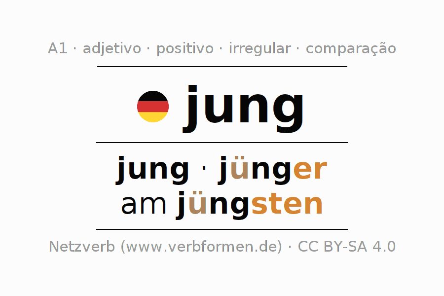 A declinação do adjetivo jung (jovem, novo) utiliza as seguintes formas de comparação jung,jünger,am jüngsten. As terminações para o comparativo e o superlativo são ü-er/ü-sten. O adjectivo jung pode ser utilizado tanto como atributivo antes de um substantivo ou como predicativo junto com um verbo.Não se pode flexionar e comparar somente o adjetivo jung, mas sim todos os adjetivos em alemão. Comentários ☆
