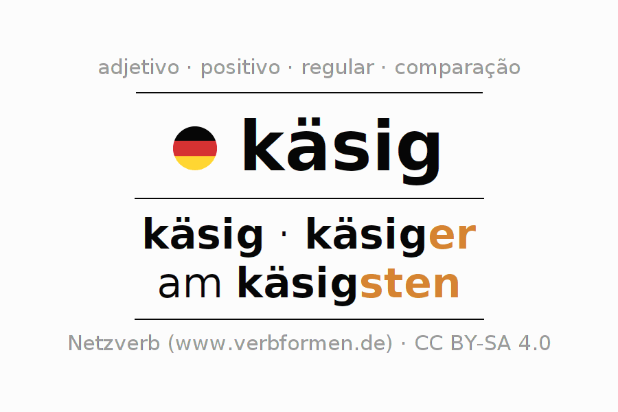 A declinação do adjetivo käsig (queijoso, pálido) utiliza as seguintes formas de comparação käsig,käsiger,am käsigsten. As terminações para o comparativo e o superlativo são er/sten. O adjectivo käsig pode ser utilizado tanto como atributivo antes de um substantivo ou como predicativo junto com um verbo.Não se pode flexionar e comparar somente o adjetivo käsig, mas sim todos os adjetivos em alemão. Comentários ☆