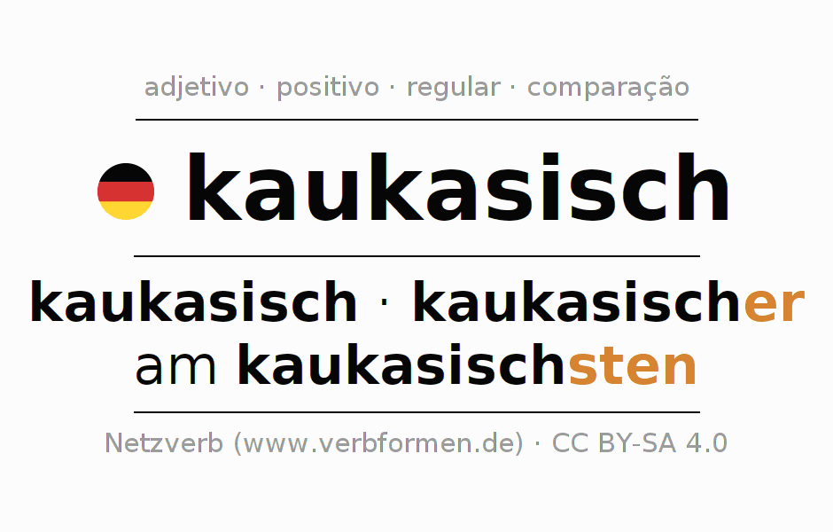 A declinação do adjetivo kaukasisch (caucasiano) utiliza as seguintes formas de comparação kaukasisch,kaukasischer,am kaukasischsten. As terminações para o comparativo e o superlativo são er/sten. O adjectivo kaukasisch pode ser utilizado tanto como atributivo antes de um substantivo ou como predicativo junto com um verbo.Não se pode flexionar e comparar somente o adjetivo kaukasisch, mas sim todos os adjetivos em alemão. Comentários ☆