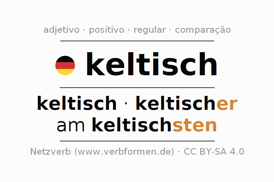 A declinação do adjetivo keltisch (céltico) utiliza as seguintes formas de comparação keltisch,keltischer,am keltischsten. As terminações para o comparativo e o superlativo são er/sten. O adjectivo keltisch pode ser utilizado tanto como atributivo antes de um substantivo ou como predicativo junto com um verbo.Não se pode flexionar e comparar somente o adjetivo keltisch, mas sim todos os adjetivos em alemão. Comentários ☆