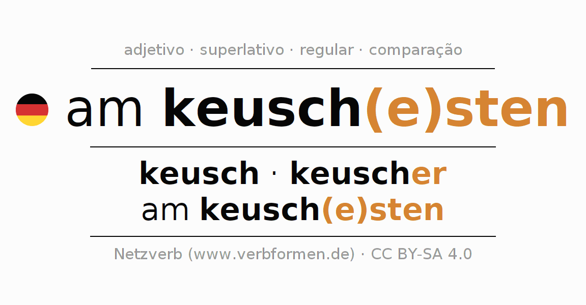 A declinação do adjetivo am keuschesten (casto, puro) utiliza as seguintes formas de comparação keusch,keuscher,am keuschesten. As terminações para o comparativo e o superlativo são er/esten. O adjectivo am keuschesten pode ser utilizado tanto como atributivo antes de um substantivo ou como predicativo junto com um verbo.Não se pode flexionar e comparar somente o adjetivo am keuschesten, mas sim todos os adjetivos em alemão. Comentários ☆
