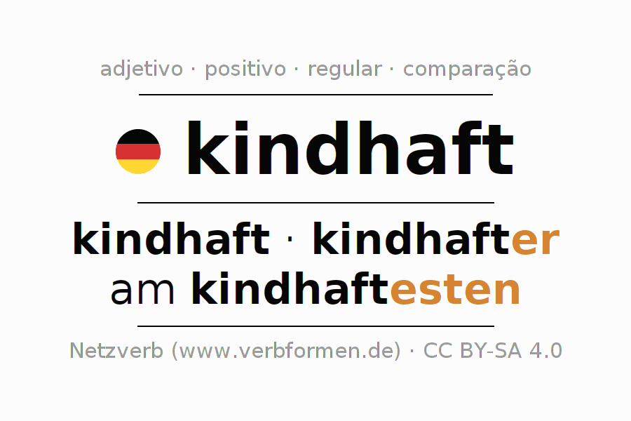 A declinação do adjetivo kindhaft (infantil) utiliza as seguintes formas de comparação kindhaft,kindhafter,am kindhaftesten. As terminações para o comparativo e o superlativo são er/esten. O adjectivo kindhaft pode ser utilizado tanto como atributivo antes de um substantivo ou como predicativo junto com um verbo.Não se pode flexionar e comparar somente o adjetivo kindhaft, mas sim todos os adjetivos em alemão. Comentários ☆
