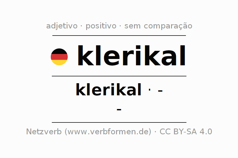 A declinação do adjetivo klerikal não forma o grau de comparação klerikal. O adjectivo não tem forma no comparativo e nem no superlativo. O adjectivo klerikal pode ser utilizado tanto como atributivo antes de um substantivo ou como predicativo junto com um verbo.Não se pode flexionar e comparar somente o adjetivo klerikal, mas sim todos os adjetivos em alemão. Comentários ☆