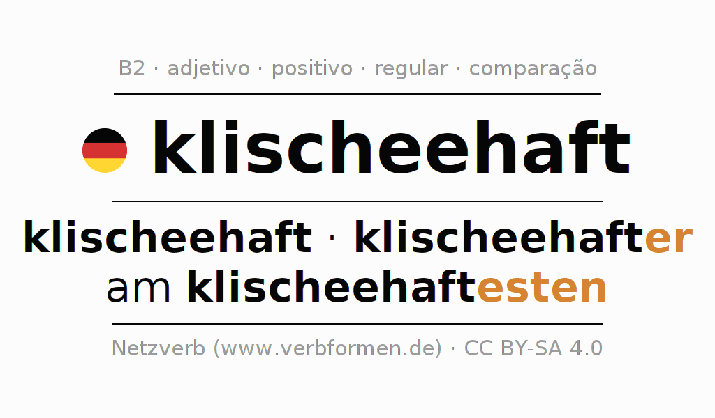 A declinação do adjetivo klischeehaft (estereotipado, previsível) utiliza as seguintes formas de comparação klischeehaft,klischeehafter,am klischeehaftesten. As terminações para o comparativo e o superlativo são er/esten. O adjectivo klischeehaft pode ser utilizado tanto como atributivo antes de um substantivo ou como predicativo junto com um verbo.Não se pode flexionar e comparar somente o adjetivo klischeehaft, mas sim todos os adjetivos em alemão. Comentários ☆