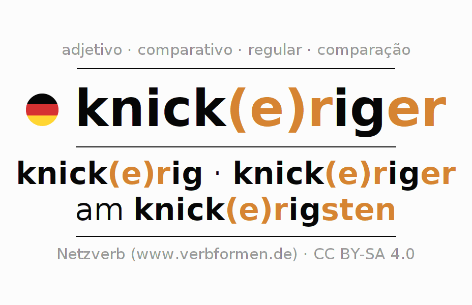 A declinação do adjetivo knickeriger (avarento, mesquinho) utiliza as seguintes formas de comparação knickerig,knickeriger,am knickerigsten. As terminações para o comparativo e o superlativo são er/sten. O adjectivo knickeriger pode ser utilizado tanto como atributivo antes de um substantivo ou como predicativo junto com um verbo.Não se pode flexionar e comparar somente o adjetivo knickeriger, mas sim todos os adjetivos em alemão. Comentários ☆