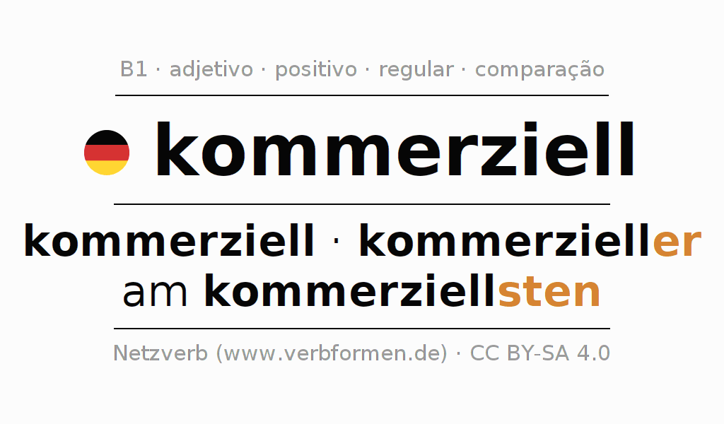 A declinação do adjetivo kommerziell (comercial, lucrativo) utiliza as seguintes formas de comparação kommerziell,kommerzieller,am kommerziellsten. As terminações para o comparativo e o superlativo são er/sten. O adjectivo kommerziell pode ser utilizado tanto como atributivo antes de um substantivo ou como predicativo junto com um verbo.Não se pode flexionar e comparar somente o adjetivo kommerziell, mas sim todos os adjetivos em alemão. Comentários ☆