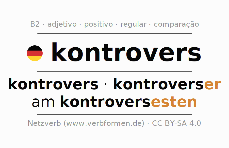 A declinação do adjetivo kontrovers (controverso, oposto) utiliza as seguintes formas de comparação kontrovers,kontroverser,am kontroversesten. As terminações para o comparativo e o superlativo são er/esten. O adjectivo kontrovers pode ser utilizado tanto como atributivo antes de um substantivo ou como predicativo junto com um verbo.Não se pode flexionar e comparar somente o adjetivo kontrovers, mas sim todos os adjetivos em alemão. Comentários ☆