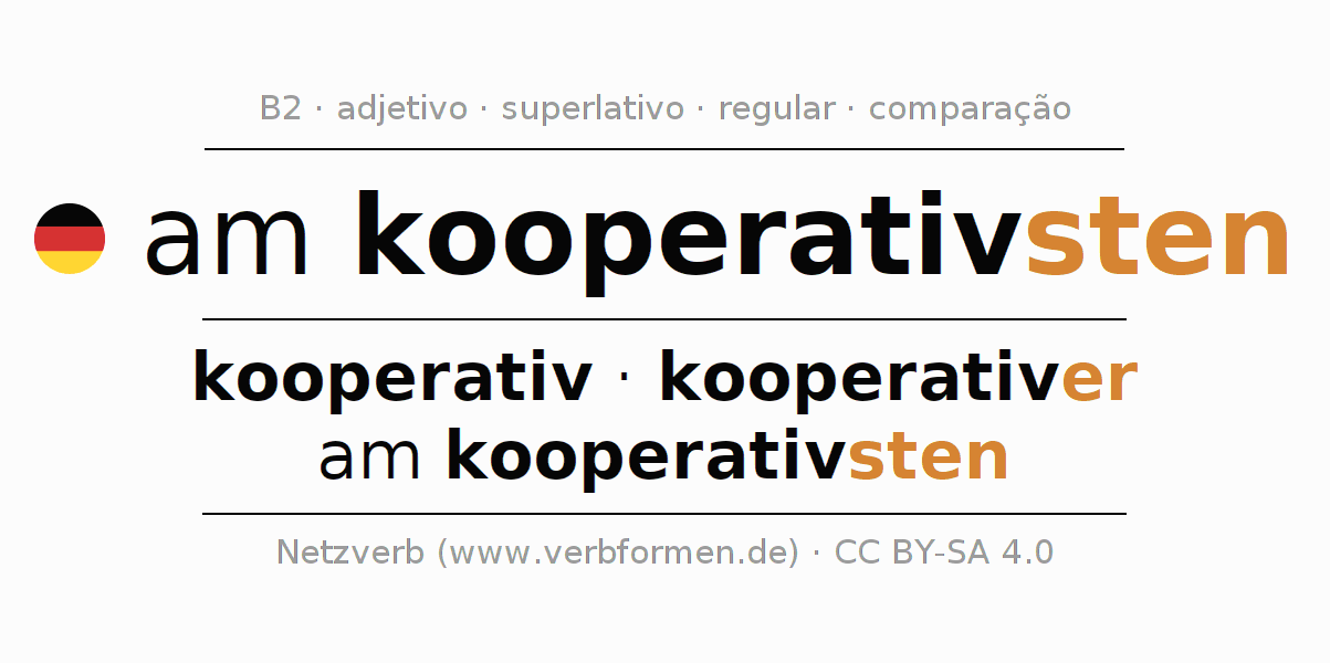 A declinação e o comparativo de am kooperativsten são apresentados online em tabelas em todas as formas: forte, fraca e mista. Assim como no singular e no plural. Também são apresentados os 4 casos: nominativo (auch 1. Fall, Wer-Fall), genitivo (auch 2. Fall, Wes-Fall, Wessen-Fall), dativo (auch3. Fall, Wem-Fall) e acusativo (auch4. Fall, Wen-Fall). Mais informações podem ser encontradas em Wiktionary am kooperativsten e am kooperativsten no Duden.