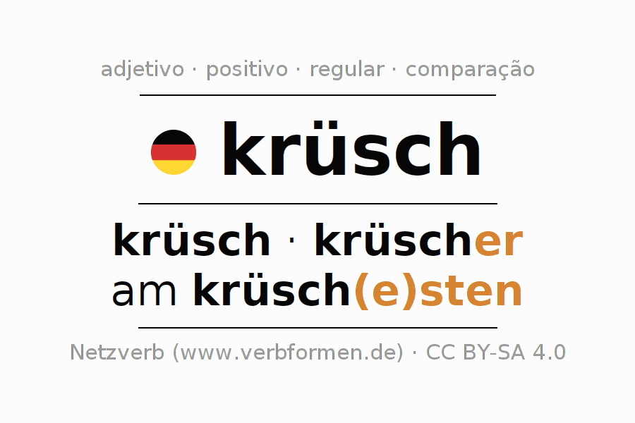 A declinação do adjetivo krüsch (exigente, escolhedor) utiliza as seguintes formas de comparação krüsch,krüscher,am krüschesten. As terminações para o comparativo e o superlativo são er/esten. O adjectivo krüsch pode ser utilizado tanto como atributivo antes de um substantivo ou como predicativo junto com um verbo.Não se pode flexionar e comparar somente o adjetivo krüsch, mas sim todos os adjetivos em alemão. Comentários ☆