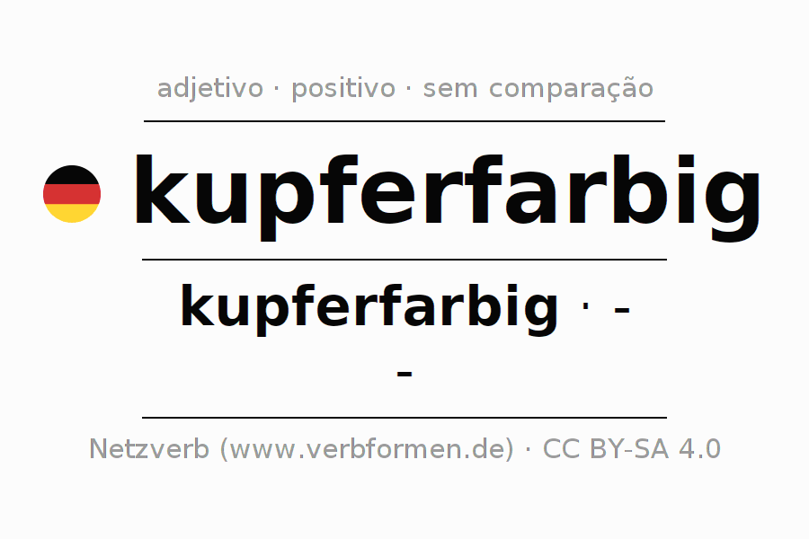 A declinação do adjetivo kupferfarbig não forma o grau de comparação kupferfarbig. O adjectivo não tem forma no comparativo e nem no superlativo. O adjectivo kupferfarbig pode ser utilizado tanto como atributivo antes de um substantivo ou como predicativo junto com um verbo.Não se pode flexionar e comparar somente o adjetivo kupferfarbig, mas sim todos os adjetivos em alemão. Comentários ☆