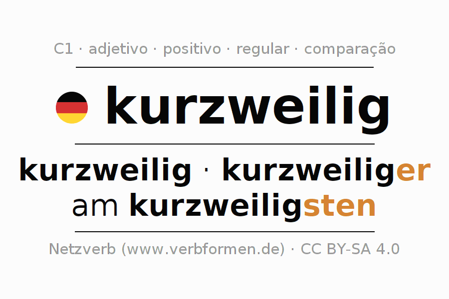 A declinação do adjetivo kurzweilig (interessante, variado) utiliza as seguintes formas de comparação kurzweilig,kurzweiliger,am kurzweiligsten. As terminações para o comparativo e o superlativo são er/sten. O adjectivo kurzweilig pode ser utilizado tanto como atributivo antes de um substantivo ou como predicativo junto com um verbo.Não se pode flexionar e comparar somente o adjetivo kurzweilig, mas sim todos os adjetivos em alemão. Comentários ☆