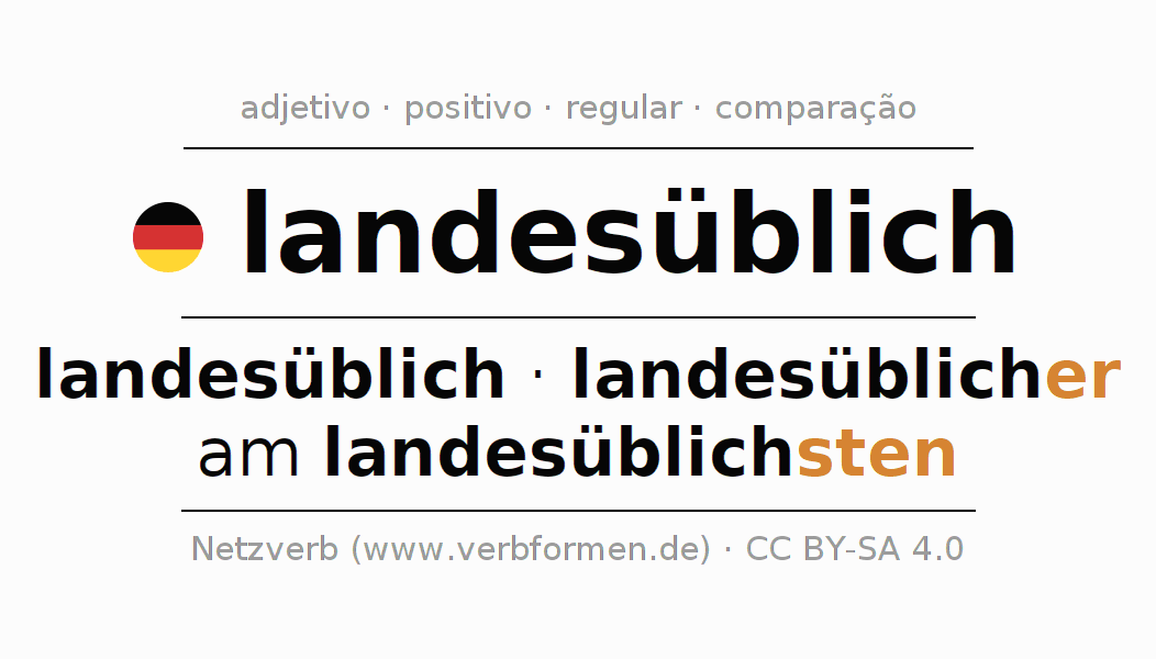 A declinação do adjetivo landesüblich (tradicional, típico) utiliza as seguintes formas de comparação landesüblich,landesüblicher,am landesüblichsten. As terminações para o comparativo e o superlativo são er/sten. O adjectivo landesüblich pode ser utilizado tanto como atributivo antes de um substantivo ou como predicativo junto com um verbo.Não se pode flexionar e comparar somente o adjetivo landesüblich, mas sim todos os adjetivos em alemão. Comentários ☆