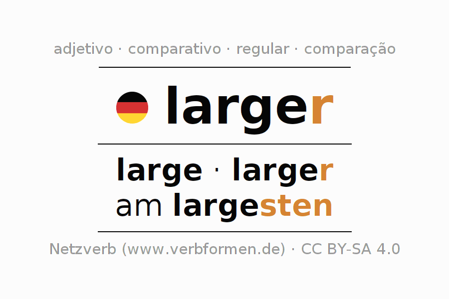 A declinação do adjetivo larger (dadivoso, generoso) utiliza as seguintes formas de comparação large,larger,am largesten. As terminações para o comparativo e o superlativo são r/sten. O adjectivo larger pode ser utilizado tanto como atributivo antes de um substantivo ou como predicativo junto com um verbo.Não se pode flexionar e comparar somente o adjetivo larger, mas sim todos os adjetivos em alemão. Comentários ☆