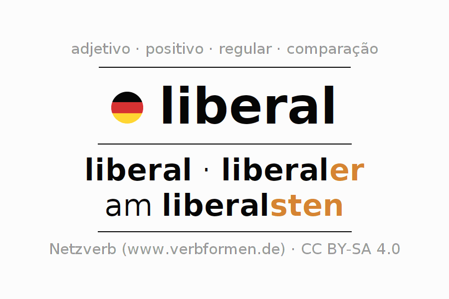 A declinação do adjetivo liberal (liberalismo, tolerante) utiliza as seguintes formas de comparação liberal,liberaler,am liberalsten. As terminações para o comparativo e o superlativo são er/sten. O adjectivo liberal pode ser utilizado tanto como atributivo antes de um substantivo ou como predicativo junto com um verbo.Não se pode flexionar e comparar somente o adjetivo liberal, mas sim todos os adjetivos em alemão. Comentários ☆