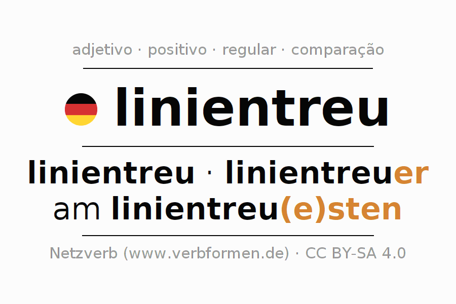 A declinação do adjetivo linientreu (fiel à linha, fiel à ideologia) utiliza as seguintes formas de comparação linientreu,linientreuer,am linientreuesten. As terminações para o comparativo e o superlativo são er/esten. O adjectivo linientreu pode ser utilizado tanto como atributivo antes de um substantivo ou como predicativo junto com um verbo.Não se pode flexionar e comparar somente o adjetivo linientreu, mas sim todos os adjetivos em alemão. Comentários ☆