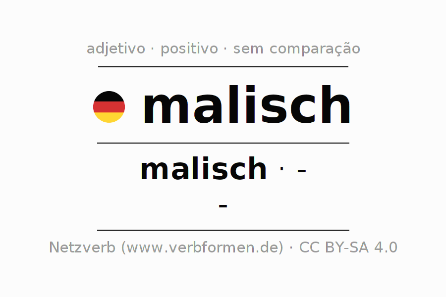 A declinação do adjetivo malisch não forma o grau de comparação malisch. O adjectivo não tem forma no comparativo e nem no superlativo. O adjectivo malisch pode ser utilizado tanto como atributivo antes de um substantivo ou como predicativo junto com um verbo.Não se pode flexionar e comparar somente o adjetivo malisch, mas sim todos os adjetivos em alemão. Comentários ☆