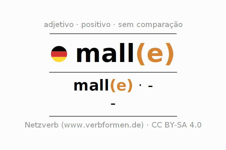 A declinação do adjetivo mall não forma o grau de comparação mall. O adjectivo não tem forma no comparativo e nem no superlativo. O adjectivo mall pode ser utilizado tanto como atributivo antes de um substantivo ou como predicativo junto com um verbo.Não se pode flexionar e comparar somente o adjetivo mall, mas sim todos os adjetivos em alemão. Comentários ☆
