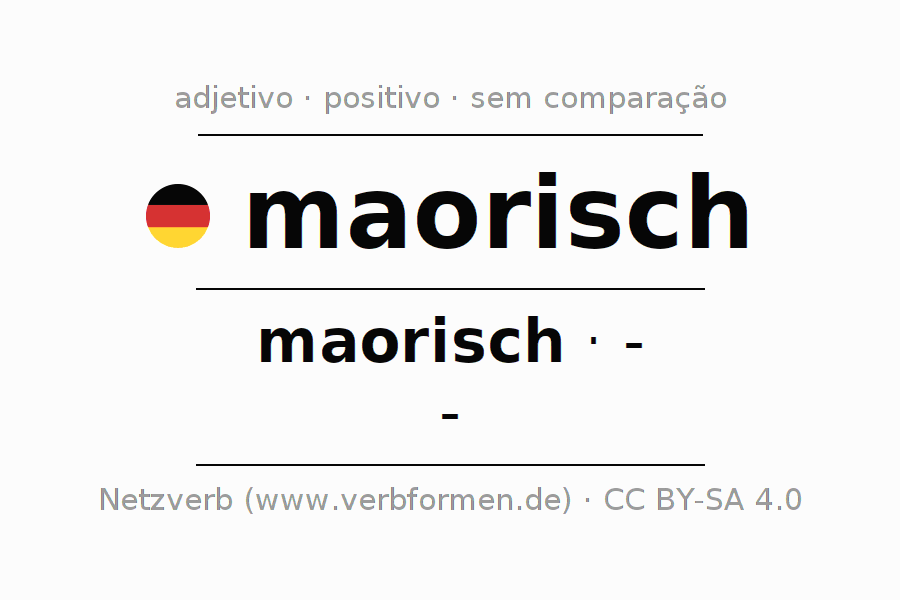 A declinação do adjetivo maorisch não forma o grau de comparação maorisch. O adjectivo não tem forma no comparativo e nem no superlativo. O adjectivo maorisch pode ser utilizado tanto como atributivo antes de um substantivo ou como predicativo junto com um verbo.Não se pode flexionar e comparar somente o adjetivo maorisch, mas sim todos os adjetivos em alemão. Comentários ☆