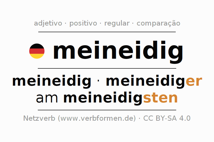 A declinação do adjetivo meineidig (perjuro) utiliza as seguintes formas de comparação meineidig,meineidiger,am meineidigsten. As terminações para o comparativo e o superlativo são er/sten. O adjectivo meineidig pode ser utilizado tanto como atributivo antes de um substantivo ou como predicativo junto com um verbo.Não se pode flexionar e comparar somente o adjetivo meineidig, mas sim todos os adjetivos em alemão. Comentários ☆